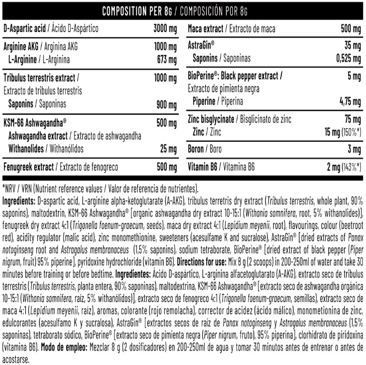 Anabol Testo Booster DMI es la fórmula anabólica más completa y revolucionaria del mercado a base de Ácido D-aspártico, Tribulus terresrtis 90% saponinas, Arginina AKG, Ashwagandha KSM-66® , Fenogreco, Maca, AstraGin®, Bisglicinato de zinc, Boro, Pimienta negra (BioPerine®) y Vitamina B6.