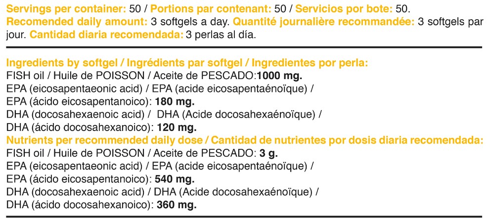 Omega 3 de PERFECT NUTRITION es un suplemento que contiene EPA y DHA, dos sustancias que mantienen el buen funcionamiento del corazón. Cada cápsula contiene aceite de pescado que aportan el DHA que contribuye al mantenimiento de la visión, la función cerebral y el corazón, y el EPA que es importante para el sistema circulatorio.