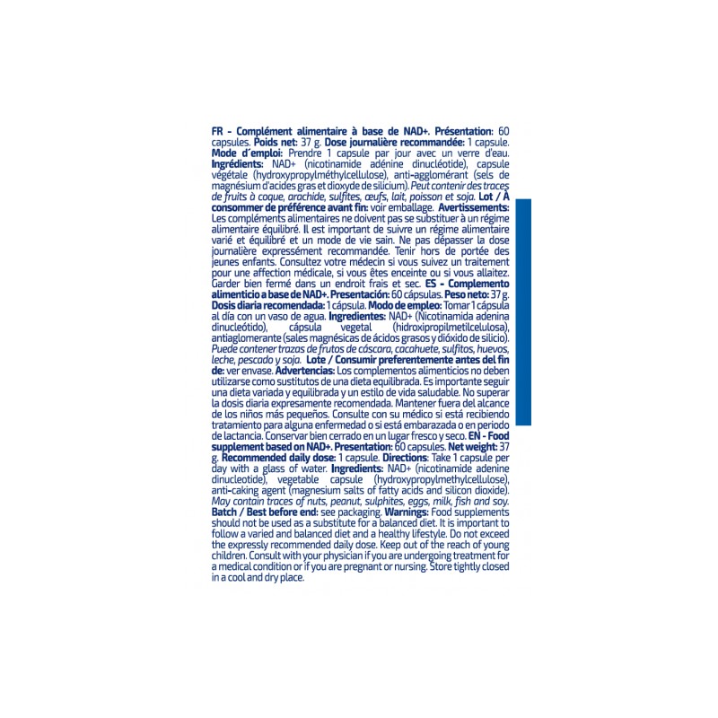 Complemento alimenticio a base de NAD⁺. Presentación: 60 cápsulas. Peso neto: 37 g.Dosis diaria recomendada: 1 cápsula. Modo de empleo: Tomar 1 cápsula al día con un vaso de agua. Ingredientes: NAD⁺ (Nicotinamida adenina dinucleótido), cápsula vegetal (hidroxipropilmetilcelulosa), antiaglomerante (sales magnésicas de ácidos grasos y dióxido de silicio). Puede contener trazas de frutos de cáscara, cacahuete, sulfitos, huevos, leche, pescado y soja. Lote / Consumir preferentemente antes del fin de: ver envase. Advertencias: Los complementos alimenticios no deben utilizarse como sustitutos de una dieta equilibrada. Es importante seguir una dieta variada y equilibrada y un estilo de vida saludable. No superar la dosis diaria expresamente recomendada. Mantener fuera del alcance de los niños más pequeños. Consulte con su médico si está recibiendo tratamiento para alguna enfermedad o si está embarazada o en período de lactancia. Conservar bien cerrado en un lugar fresco y seco.