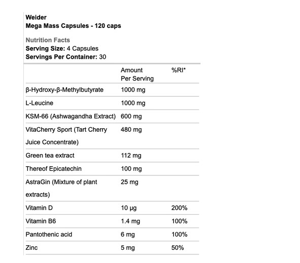El concentrado de Mega Mass cápsulas a base de L-leucina y HMB se combinan con vitamina D y zinc para respaldar la función muscular y la síntesis de proteínas musculares. El extracto de cereza en polvo y extracto de té verde estandarizado al 90% de epicatequina, trabajan juntos para lograr un potente efecto antioxidante en tu organismo.