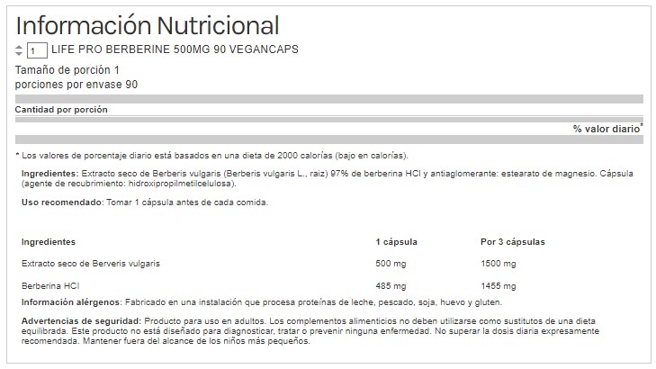 MODO DE EMPLEO: Consuma 500 mg de berberina (1 cápsula) de 2 a 3 veces al día.