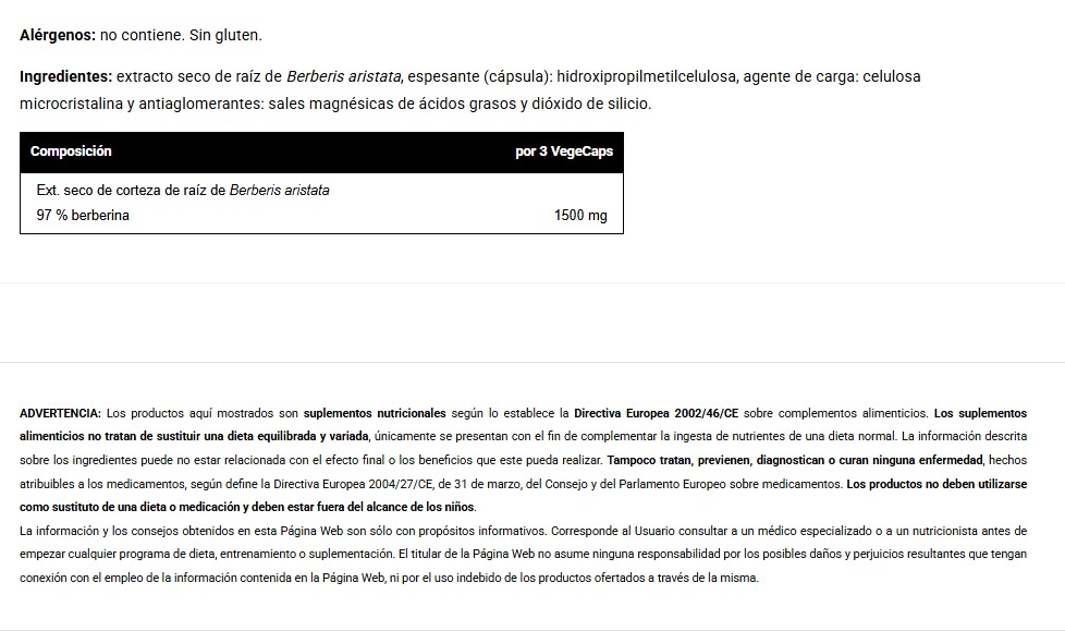 ADVERTENCIA: Los productos aquí mostrados son suplementos nutricionales según lo establece la Directiva Europea 2002/46/CE sobre complementos alimenticios. Los suplementos alimenticios no tratan de sustituir una dieta equilibrada y variada, únicamente se presentan con el fin de complementar la ingesta de nutrientes de una dieta normal. La información descrita sobre los ingredientes puede no estar relacionada con el efecto final o los beneficios que este pueda realizar. Tampoco tratan, previenen, diagnostican o curan ninguna enfermedad, hechos atribuibles a los medicamentos, según define la Directiva Europea 2004/27/CE, de 31 de marzo, del Consejo y del Parlamento Europeo sobre medicamentos. Los productos no deben utilizarse como sustituto de una dieta o medicación y deben estar fuera del alcance de los niños.