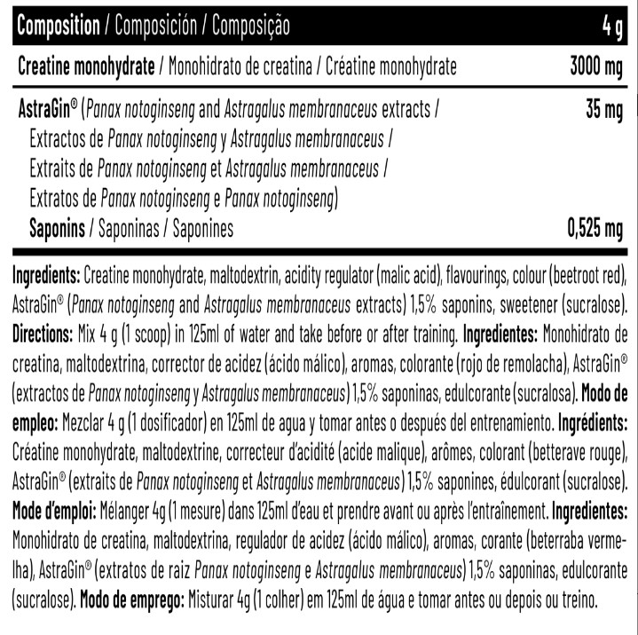 contiene en su formulación la patente AstraGin®, un complejo a base de Panax notoginseng y Astragalus membranaceus, para garantizar una óptima y total absorción de la creatina, no contiene azúcares, ni aspartamo, ni ningún tipo de relleno, lo que se traduce en una fórmula que se centra única y exclusivamente en la función de todos sus ingredientes activos.
