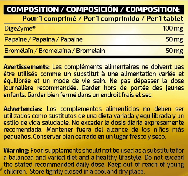 Ingredientes: Maltodextrina, DigeZyme® (complejo multienzimático a base de amilasa, proteasa, lactasa, lipasa y celulasa), papaína y bromelaína. Puede contener trazas de gluten, huevos, leche, pescado y soja.