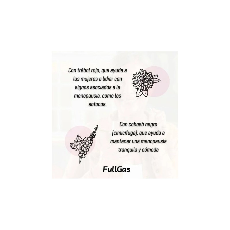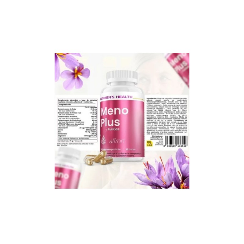 MenoPlus (Menopausia*) de Fullgas Sport Fórmula para contribuir al confort en la menopausia y a reducir los sofocos, gracias a ingredientes como *salvia, trébol rojo y cimicífuga*. Con extractos de plantas, melatonina, vitaminas y minerales. 100% vegano y sin gluten.