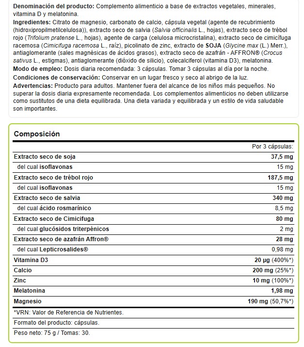 La formulación de este complemento alimenticio se ha desarrollado con ingredientes respaldados por investigaciones científicas que analizan su potencial para favorecer el bienestar durante y después de la menopausia (bibliografía desplegable disponible).
