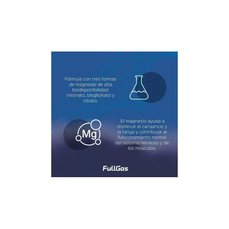 TrioMag de Fullgas Sport Fórmula avanzada con tres formas de magnesio de alta biodisponibilidad: Treonato (Magtein®) + Bisglicinato + Citrato (MagGran®). 100% vegano y libre de alérgenos.