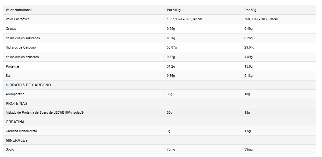 MODO DE EMPLEO: Tomar 4 cacitos (50g aprox) diluidos en 250-300ml de agua después del entrenamiento.
