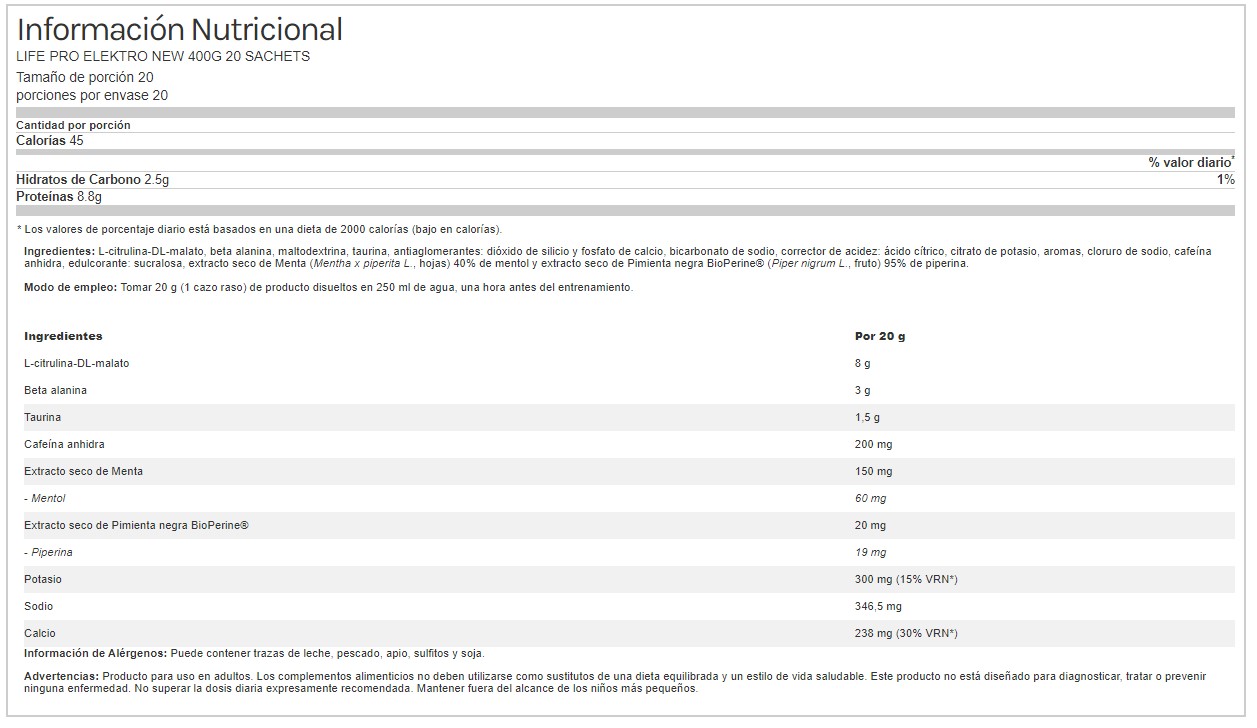 MODO DE EMPLEO: l método más recomendado es diluir una monodosis de Life Pro New Elektro en agua, y consumir 30 minutos antes de realizar tu actividad física. Su dosis puede llegar a duplicarse, dependiendo de la tolerancia a las sustancias estimulantes de cada individuo. No se recomienda sobrepasar la dosis de cafeína recomendada por especialistas de la salud.