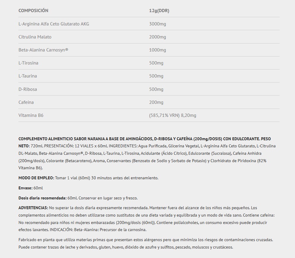 Modo de empleo: Tomar un vial, 20 minutos antes del entrenamiento.