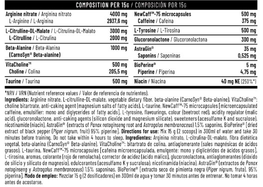 MODO DE EMPLEO: Mezclar 15 g (2 cacitos) en 300 ml de agua y tomar 30 minutos antes del entrenamiento. No tomar 4 horas antes de acostarse.