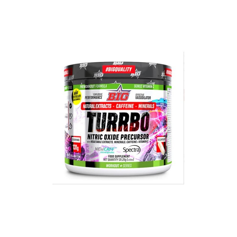 Turrbo de BIG® es un complejo pre-entreno con extractos vegetales, minerales, cafeína y vitamina C reformulado para aumentar y prolongar la acción vasodilatadora del óxido nítrico, así como para aportar nutrientes a la musculatura y prevenir la acción de radicales libres durante tus sesiones de entrenamiento mas intensas.