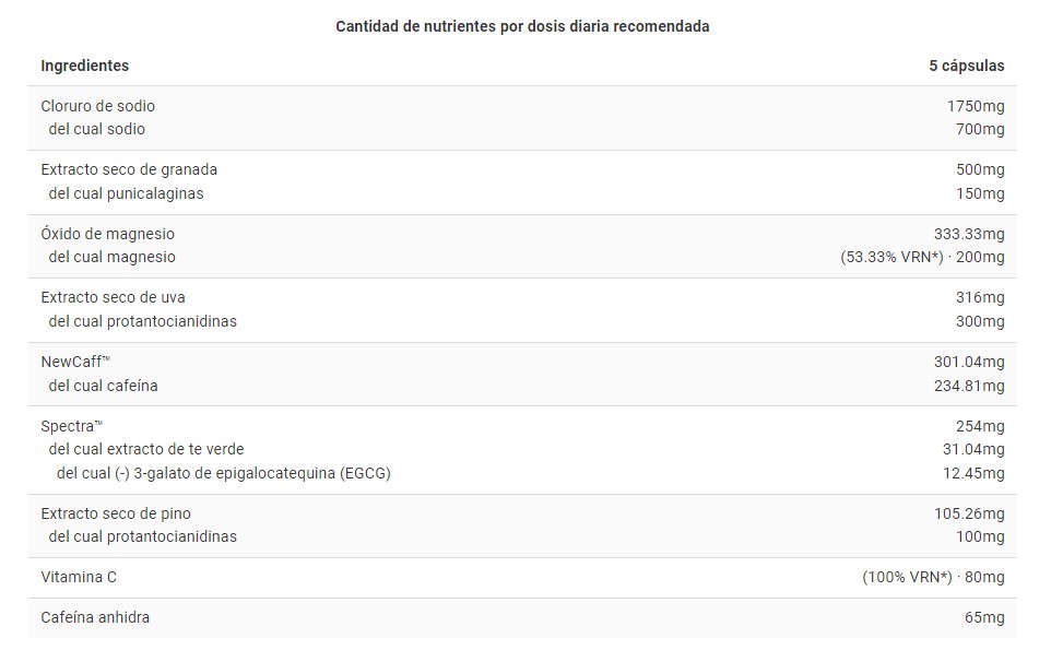 Modo de empleo: Tomar 5 cápsulas aproximadamente una hora antes de realizar la actividad física. No tomar en un plazo de 4 horas antes de dormir.
