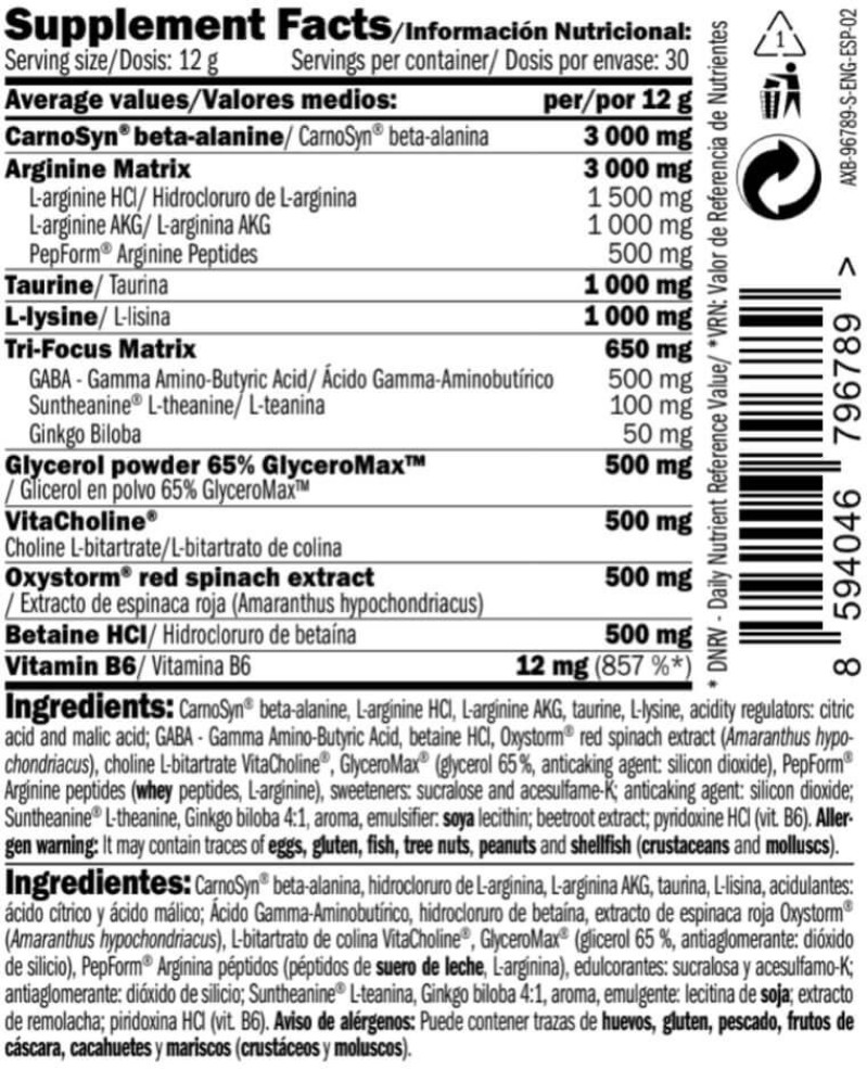 Advertencias: Limitar el uso de medicamentos, comidas o bebidas que contengan cafeína durante el uso de este producto. No utilice este producto si está embarazada o en período de lactancia. El producto no está indicado para niños de cualquier edad. Mantener fuera del alcance de los niños más pequeños. ¡No superar la dosis diaria expresamente recomendada! Los complementos alimenticios no deben utilizarse como sustitutos de una dieta equilibrada. Seguir las recomendaciones de los profesionales antes de tomar este complemento alimenticio. Conservar a una temperatura no superior a 25°C en un lugar fresco y seco, lejos de la luz solar directa. El fabricante no se responsabiliza de los daños causados por uso, conservación o almacenamiento inapropiado por parte del consumidor.