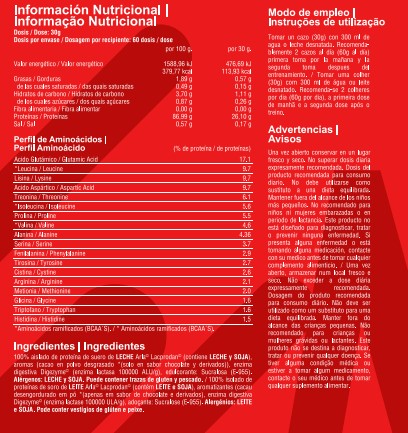100% Aislado de proteína de suero de leche (Lacprodan® SP-9225), Aromas (cacao en polvo desgrasado*(solo en sabor chocolate y derivados)), Complejo multienzimático DigeZime© (Alfa-amilasa, Proteasa, neutra, Celulasa, Lactasa, Lipasa), Edulcorante: Sucralosa (E-955). Puede contener trazas de gluten y soja.