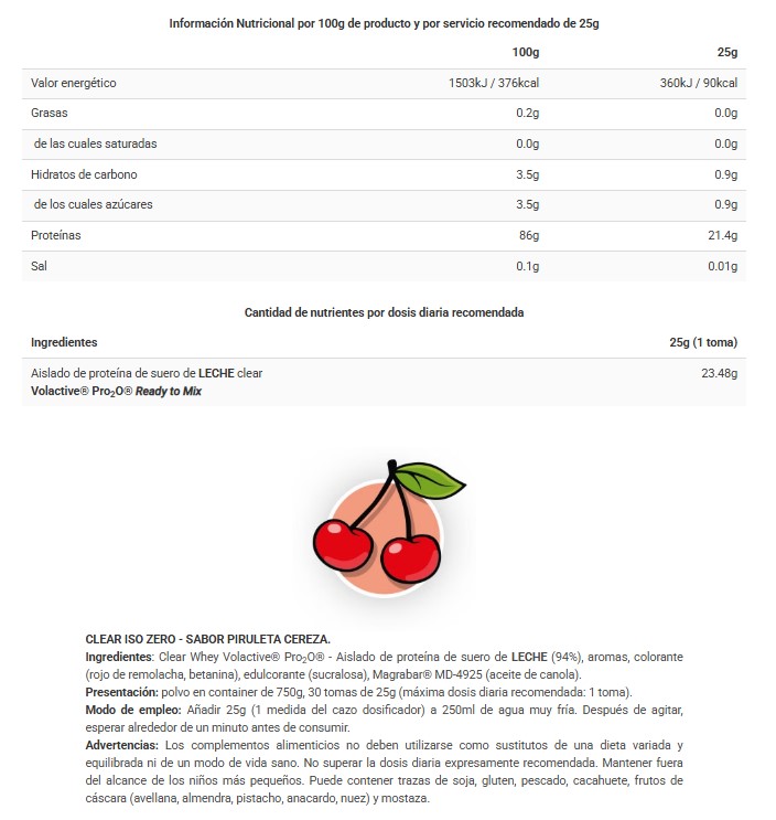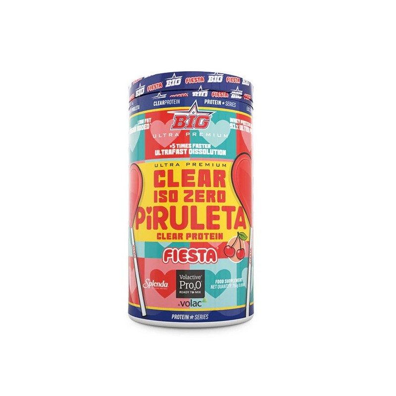 Clear Iso Zero Piruleta de BIG elaborada con la prestigiosa patente Volactive® Pro2O® Ready to Mix de Volac® y con un nuevo sabor desarrollado en colaboración con Fiesta®. La nueva proteína CLEAR ISO ZERO PIRULETA FIESTA® de BIG® contiene un 94% de materia prima bruta, manteniendo una pureza muy por encima de la de sus competidores, con hasta un 66% menos de las sustancias antiespumantes presentes en la mayoría de las proteínas claras.