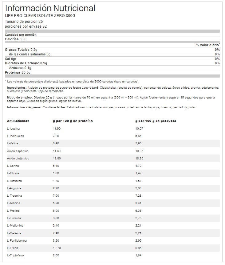La proteína empleada cuenta con la patente Lacprodan Clearshake. Es una proteína de alto valor biológico. Contiene los 9 aminoácidos esenciales que nuestro organismo no puede producir por sí mismo. Cuenta con una elevada concentración de proteínas del 81%.