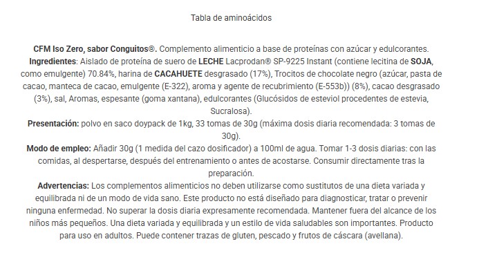 Iso CFM Zero Conguitos contiene una elevada cantidad de nutrientes, aportándonos aminoácidos y proteínas que nos ayudan a desarrollar la fibra muscular y proteger nuestro sistema inmunológico, también es ideal para incrementar tu vitalidad en los entrenamientos, además gracias a su combinación es perfecto para conservar la musculatura, mantener saludable tus huesos.