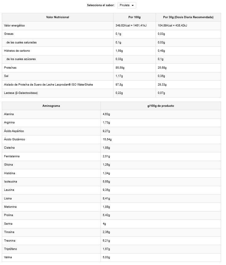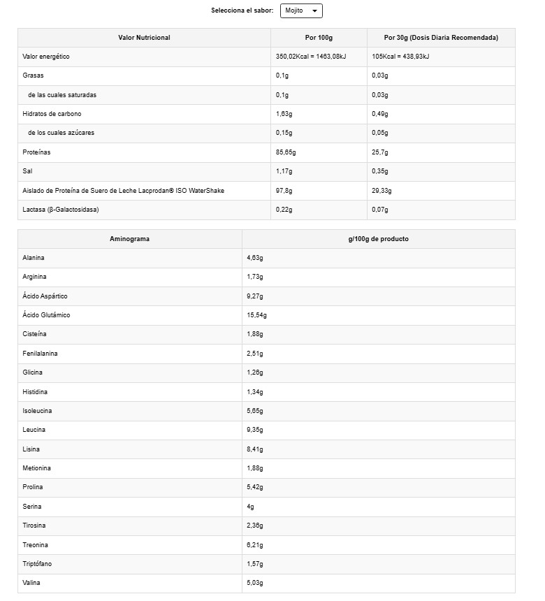 BEBIDA EN POLVO A BASE DE PROTEÍNAS LÁCTEAS CON EDULCORANTE SABOR MOJITO. INGREDIENTES: Aislado de Proteína de Suero de LECHE Lacprodan® ISO WaterShake (97,8%), Aromas, Edulcorante (Sucralosa), Lactasa 10.000 FCC ALU/g (0,22%) y Espirulina en Polvo Ecológica (Arthrospira Platensis, Algas).
