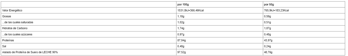 Ingredientes: Aislado de Proteína de Suero de LECHE 90% Isolac® (Emulgente - Lecitina de SOJA) (97,52%), Aromas (Contiene LECHE y DERIVADOS), Cacao en Polvo, Lactasa 10.000 FCC-ALU/g (¬-Galactosidasa) (0,2g), Edulcorante (Sucralosa) y Cloruro de Sodio.