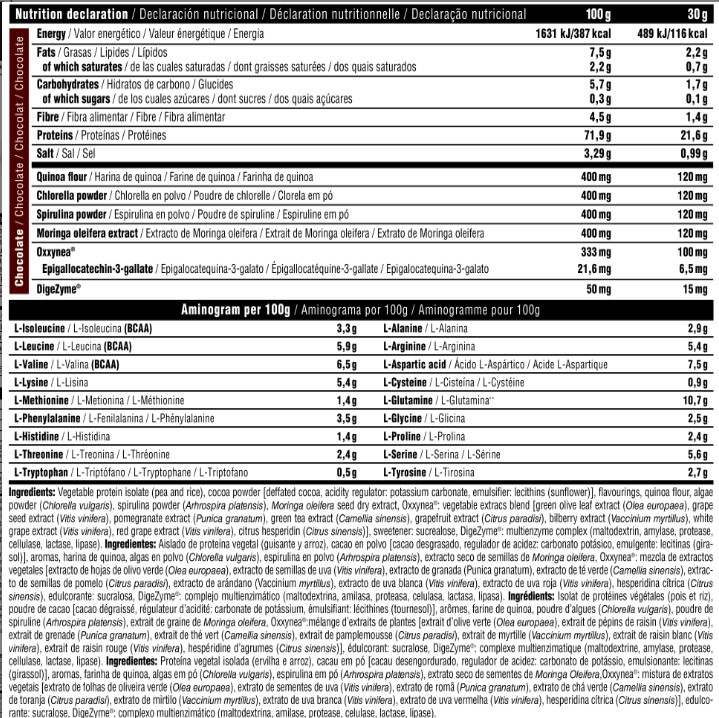 Isolate Vegan+ DMI es una deliciosa e innovadora fórmula a base de aislado de proteína de guisante y arroz, un patentado complejo de enzimas digestivas (DigeZyme®), un patentado complejo de frutas y verduras (Oxxynea®) y una exclusiva mezcla de superalimentos (quinoa, chlorela, espirulina y moringa), convirtiéndola en la proteína vegana más avanzada del mercado.