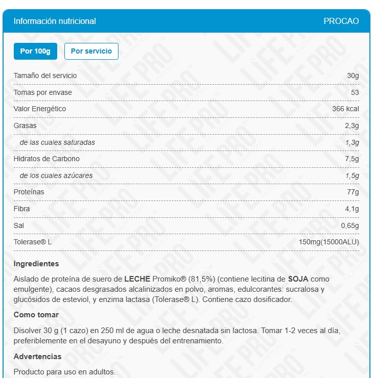 Isolate Zero Procao de LIFE PRO es el mejor aislado de proteína de la marca. Con 87% de concentración proteica, es bajo en grasas y carbohidratos, por lo que te ayudará con tu rendimiento deportivo sin influir negativamente en tu dieta.