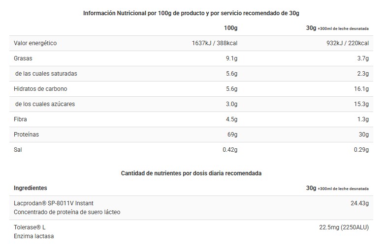 Ingredientes: Concentrado de proteína de suero de LECHE Lacprodan® SP-8011V Instant (contiene lecitina de SOJA como emulgente) 81.43%, Cacao en polvo [cacao desgrasado, corrector de acidez (carbonato potásico), emulgente (lecitinas (girasol))] 15.3%, Aromas, Edulcorante (Sucralosa), Enzima Lactasa-ToleraseTM (β-galactosida), Edulcorante (Glucósidos de esteviol procedentes de estevia).