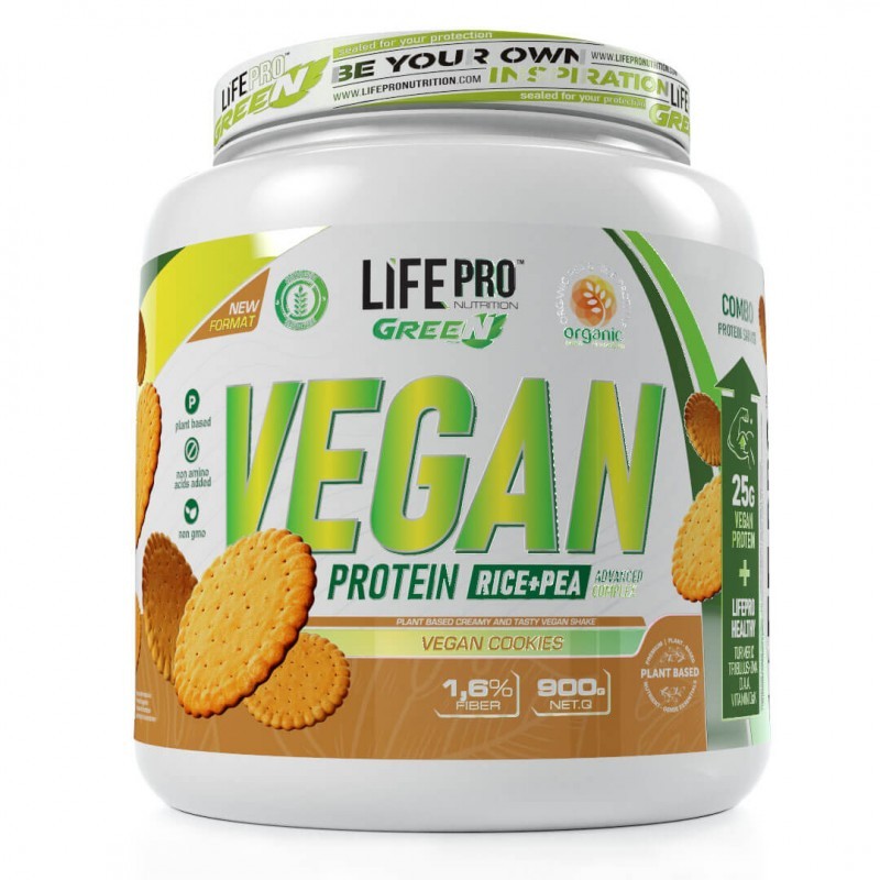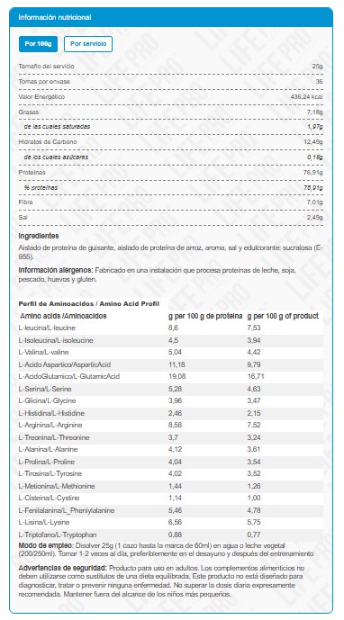 Vegan Protein de LIFE PRO ha sido elaborada con dos fuentes diferentes de proteína, con el objetivo de lograr un aminograma completo: proteína de guisante y arroz de origen orgánico. Todos sus ingredientes proceden de orígenes vegetales y, por el otro, tanto la proteína de guisante como la de arroz están catalogadas como “orgánicas”. Esta proteína es apta para veganos y vegetarianos.