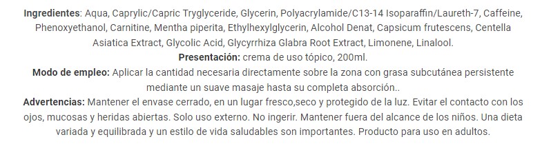 Modo de Empleo: Aplicar la cantidad necesaria directamente sobre la zona con grasa subcutánea persistente mediante un suave masaje hasta su completa absorción.