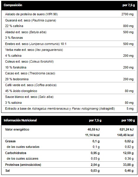 Hellcore contiene una exclusiva fórmula elaborada a partir de extractos vegetales naturales ricos en cafeína1 y otros principios activos cuya acción sinérgica provoca un intenso aumento de la actividad metabólica y un uso más eficaz de los productos energéticos generados durante la lipólisis en los procesos básicos vitales.
