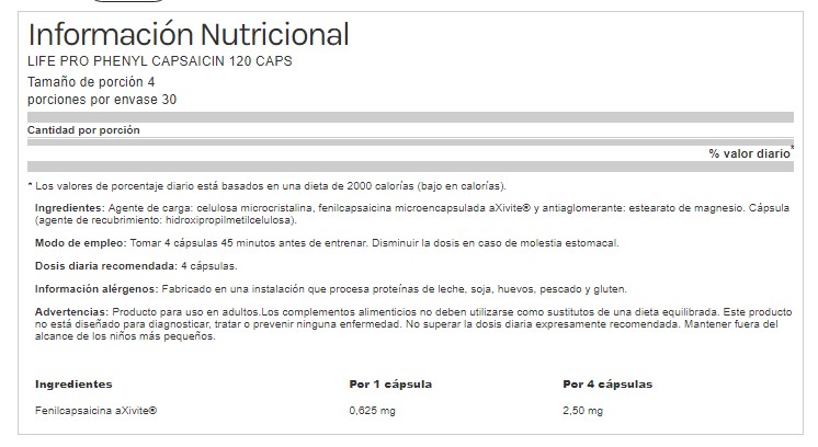 Phenyl Capsaicin de Life Pro es un alcaloide que procede de una planta del género capsicum, que cuenta con un gran número de propiedades enfocadas en la mejora del rendimiento, efecto termogénico y analgésico natural.