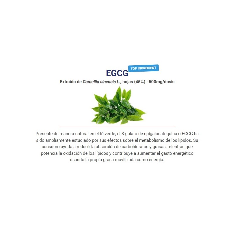 El extracto de te verde concentrado presente en REAL EGCG contiene un 55% de EGCG por dosis, la catequina mas activa y estudiada por su capacidad para estimular la oxidación de las grasas y su capacidad para aumentar el rendimiento físico usando la propia grasa como fuente de energía extra. Además, el extracto concentrado contiene un 2% de cafeína que actúa de manera sinérgica en la activación de la lipólisis.