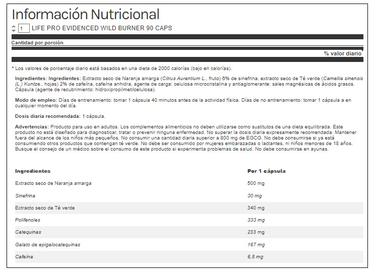 Wild Burner de Life Pro es un complemento idóneo para épocas de pérdida de grasa y definición que favorece la oxidación de grasa y aumento del metabolismo. Es el hermano mayor de Evidenced Burner. Ha sido formulado con cafeína anhidra, sinefrina y extracto de té verde.
