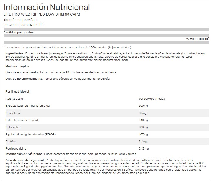 Life Pro Wild Ripped Low Stim contiene, extracto de té verde p-sinefrina (extracto de citrus aurantium) y fenilcapsaicina de la patente Axivite.