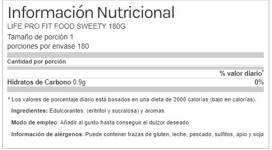 Fit Food Sweety de LIFE PRO a sido creado combinando dos edulcorantes bajos en calorías: sucralosa y eritritol. Ambos son considerados dos edulcorantes sin aporte calórico. Life Pro Fit Food Sweety es una forma espectacular de disfrutar de tus sabores dulces favoritos, manteniendo un estilo de vida saludable y lograr mayor adherencia a la dieta.