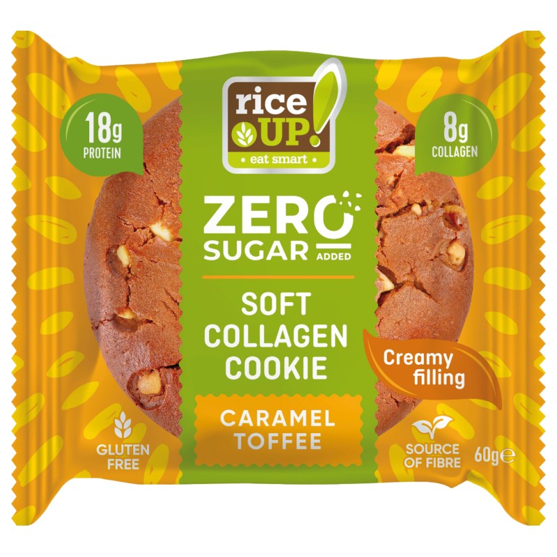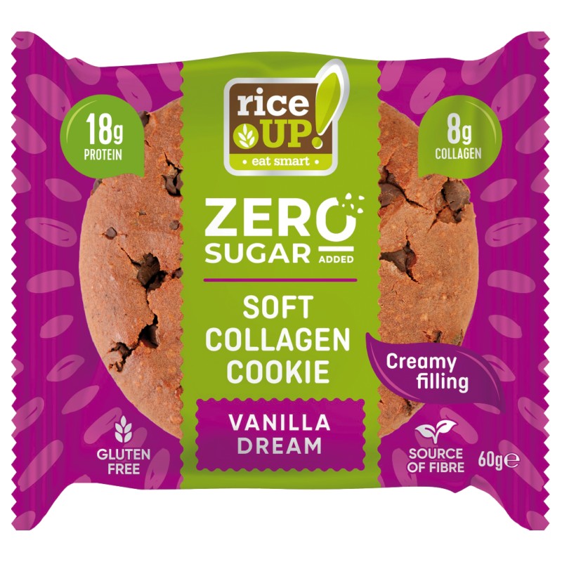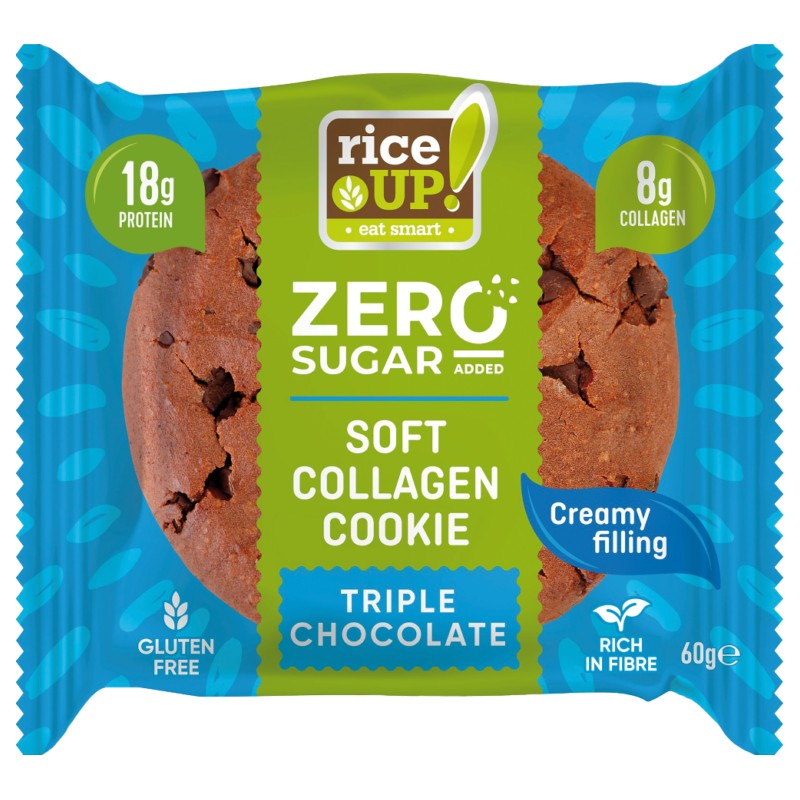 Galletas de colágeno FITSPO Galletas de colágeno RiceUP!: textura suave con trocitos de chocolate real y un delicado relleno cremoso, ¡una sinfonía de sabores y texturas! Un triple placer para los sentidos, sin aceite de palma y sin la culpa del azúcar añadido.