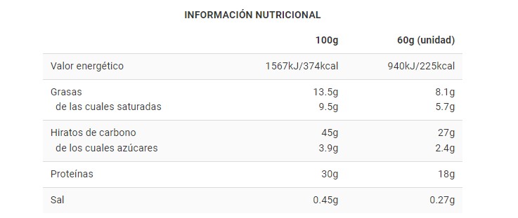 Ingredientes: Humectante: jarabe de maltitol, Cobertura de chocolate con LECHE con edulcorante (cacao: 36% mínimo [edulcorante: maltitol, manteca de cacao, pasta de cacao, LECHE en polvo, LECHE desnatada en polvo, emulgente: lecitinas (SOJA), aroma]) (19%), Proteína de la LECHE [proteínas de la LECHE, emulgente: lecitinas (SOJA)] (17,8%), Crema sabor chocolate [humectante: jarabe de sorbitol, maltodextrina, manteca de coco, humectante: glicerina, LECHE desnatada en polvo, aroma (LECHE), emulgente: lecitinas (SOJA), conservador: sorbato potásico] (17%), Jarabe de péptidos de colágeno bovino [péptidos de colágeno bovino, agua, conservador: sorbato potásico], Nuggets de SOJA al cacao [aislado de proteína de SOJA, cacao, almidón de tapioca] (6,8%), Aislado de proteína de SOJA, Humectante: maltitol, Humectante: jarabe de sorbitol, Cobertura de chocolate negro (cacao: 52% mínimo con edulcorante [edulcorante: maltitol, pasta de cacao, manteca de cacao, emulgente: lecitinas (SOJA), aroma]) (1%), Aromas, Manteca de cacao desodorizada, Cacao en polvo desgrasado, LECHE desnatada en polvo, Emulgente: lecitinas (SOJA).