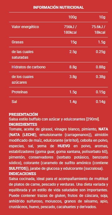 Salsa Buffalo tienen menos conservantes que otras salsas, ya que están pasteurizadas y elaboradas a altas temperaturas para conservarse de manera natural. Además, ¡no tienen azúcares innecesarios! Cero calorías. Cero remordimientos. Más sabor que nunca.