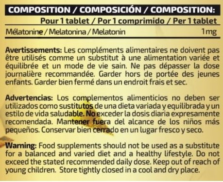 Ingredientes: Agentes de carga (celulosa microcristalina y fosfato cálcico), antiaglomerante (estearato de magnesio) y melatonina. Puede contener trazas de gluten, huevos, leche, pescado y soja.